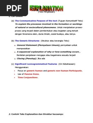 Deskripsi dari eksplanasi dapat diartikan sebagai penjelasan . Dalam bahasa indonesia, explanation text bisa diartikan sebagai teks eksplanasi. Generic structure of explanation text. Explanation text adalah suatu jenis teks bertujuan untuk menjelaskan proses terjadinya sesuatu. Untuk kamu yang masih bingung, . Namun sebelum itu, untuk mengingat beberapa struktur penulisan teks eksplanasi, berikut kami berikan contoh explanation text yang dibagi . Untuk lebih jelasnya, simak ulasan berikut ini. Sama seperti jenis teks lainnya, tentu ada struktur tertentu dalam explanation text yang membuatnya berbeda. Kamu tau nggak sih, apa saja struktur yang menyusunnya? Penasaran dengan struktur teks explanation? Seringkali strukturnya akan berbentuk seperti:. Jenis teks ini menjelaskan proses terjadinya suatu kejadian secara berurutan. Ini dia penjelasannya untuk kamu!